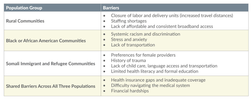There are cross-cutting strategies for improving access to maternal health care for rural, Black, and Somali immigrant and refugee populations. A community-engaged approach to addressing barriers to maternal health care access, such as transportation, child care, language and health system navigation, along with an expanded maternal health workforce and increased access to health insurance, can lead to improved outcomes.