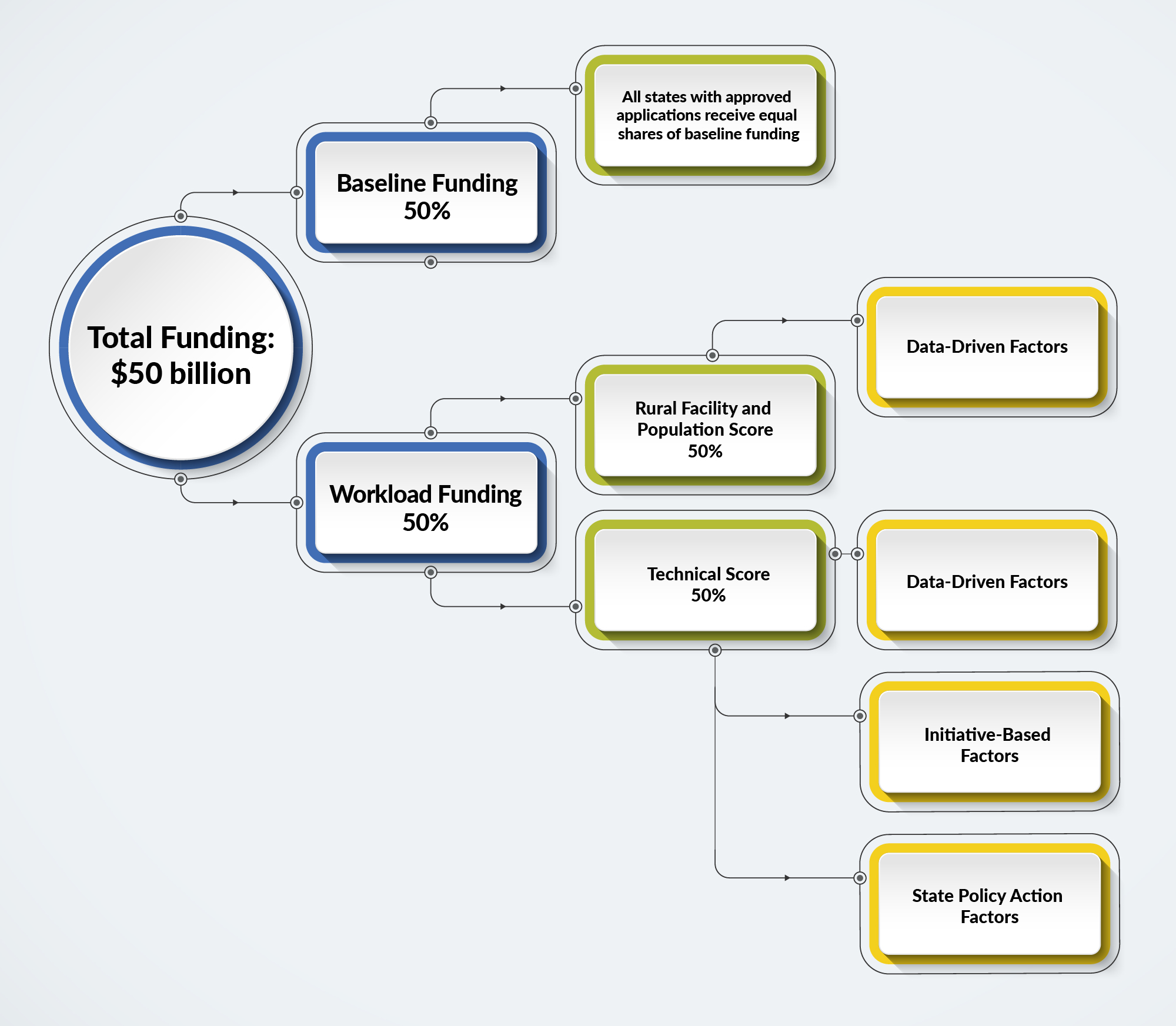 Understanding how the $50 billion is structured and distributed is critical for applicants and stakeholders alike, as the funding design itself pushes states to balance feasibility with forward-thinking innovation. The RHT Program will award $10 billion annually, with each year’s funding evenly split into two streams: baseline funding and workload funding (Figure 1). Baseline funding is provided in equal shares to all states with approved applications, giving states a stable foundation to support the sustainability of their rural health systems. Workload funding, by contrast, is distributed through a competitive process that is based upon a state’s score across two categories — its rural facility and population score, which is based upon data-driven measures and is fixed upon scoring, and its technical score, which is based upon the following types of metrics: