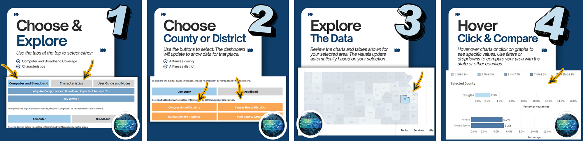 The Kansas Health Institute has developed this Digital Divide dashboard to provide a detailed overview of broadband and computer access across Kansas. Using 2019-2023 U.S. Census Bureau American Community Survey (ACS) data, the dashboard allows users to explore county-level data on computer and broadband access, as well as demographic breakdowns of populations without computer access by age, race, ethnicity, employment, education and income. This tool highlights disparities in ownership and availability, helping communities target efforts to close the digital divide.