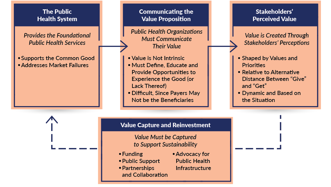 Public health organizations begin by delivering foundational services that protect communities and promote health. But services alone do not secure the future. Their meaning has to be communicated in ways that connect to what different stakeholders care about. Only then can value be perceived, shaping trust, legitimacy and willingness to invest. Value must first be recognized before it can be translated into funding, partnerships, policy support and public commitment that sustain the work. This ongoing cycle, from service delivery to communication, to perceived value, to captured and reinvested support, is what allows public health impact to endure rather than erode (Figure 1).