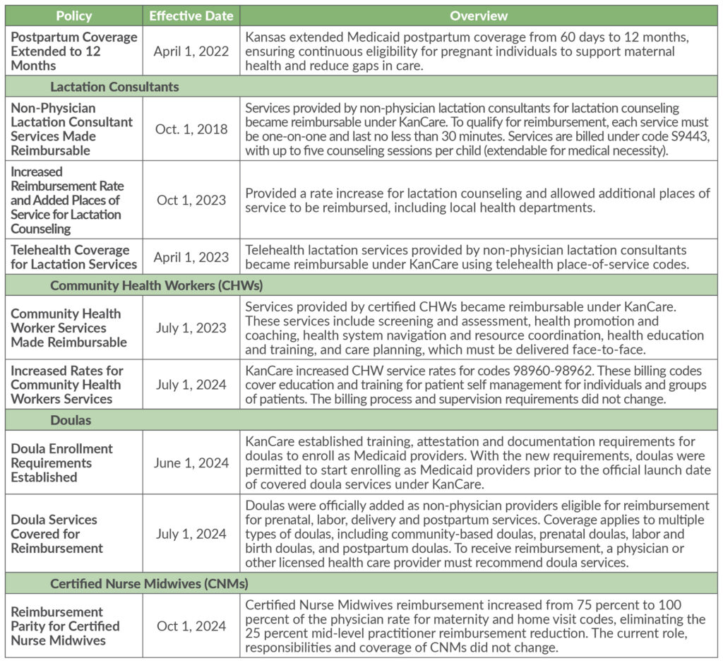 - Policy changes in KanCare have extended postpartum Medicaid coverage from 60 days to 12 months for beneficiaries and have expanded the care team by allowing reimbursement for services provided by lactation consultants, community health workers and doulas. Reimbursement rates were also increased for community health workers and Certified Nurse Midwives.